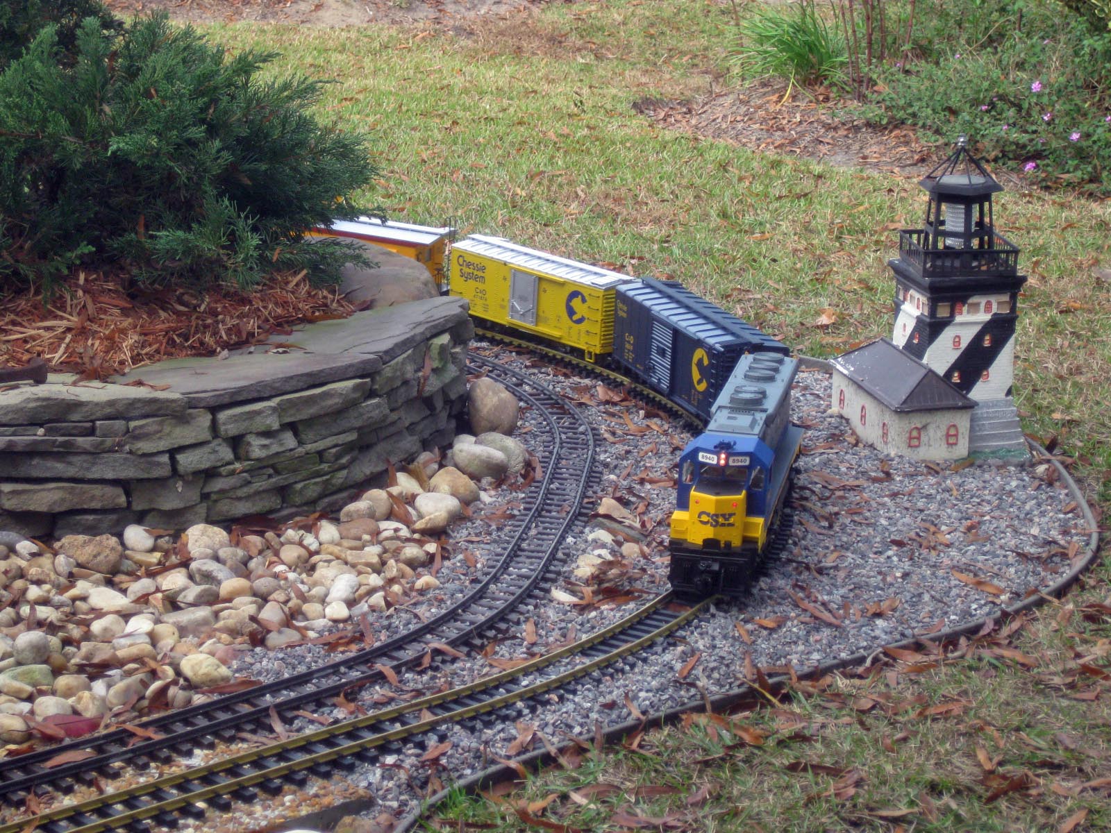 I changed my layout from one to two main lines and made the outer one from a larger diameter radius track. This was necessitated when I purchased a new Aristocraft SD-45 CSX diesel engine at the Central Florida RR show early in Oct. When I got home, I found out that the curvature of my existing track was too tight for the new engine, so I got a wider radius curve track and decided to expand my set up to two main lines, so that the diesel runs on the outer loop while my Bachmann 4-6-0 steam engine runs on the inner loop. I had to clear out a lot of dirt and plants to make way for the change. Made a number of trips to get stone dust and small-size gravel for the bed and borrow on several occasions a wheel barrow. I also made a scalloped red brick wall around the garden area so that the rain does not wash the mulch onto the track.